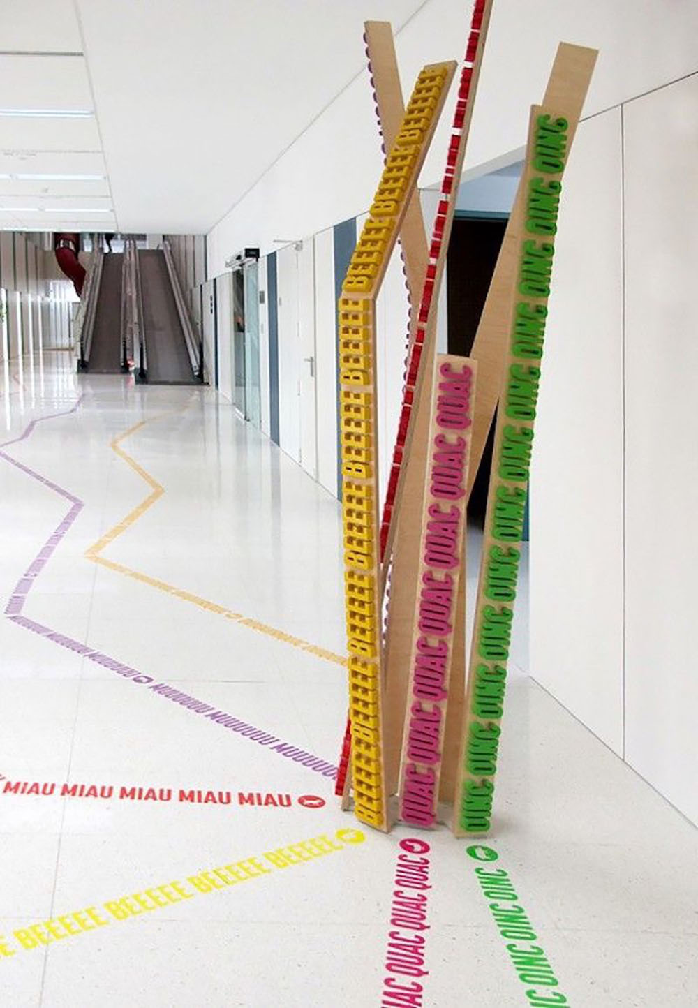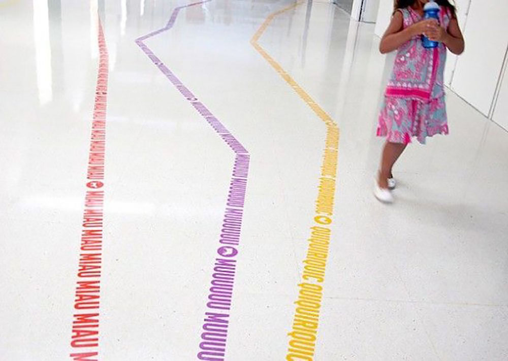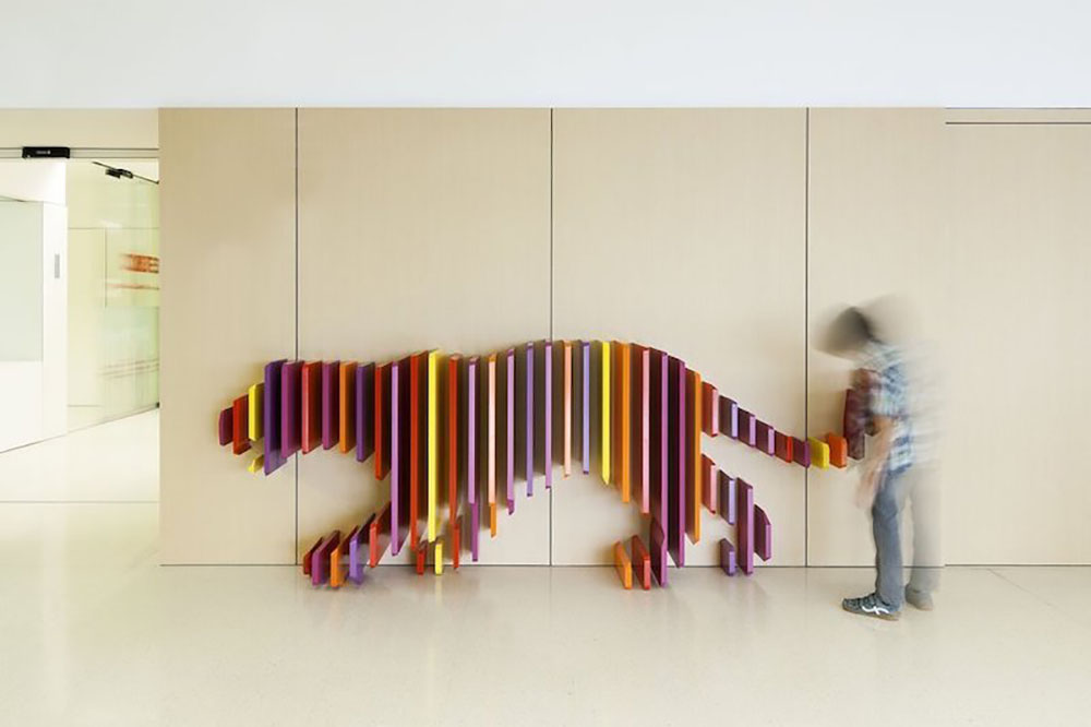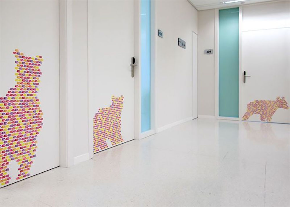 Rai Botey和Dani Rubio創(chuàng)造了動(dòng)物躲貓貓的游戲,每個(gè)動(dòng)物代表著不同的科室,根據(jù)動(dòng)物尾巴的長(zhǎng)短決定裝置木條的長(zhǎng)度,整體顯得有趣,引起人們的好奇心。木條上英文的是動(dòng)物所發(fā)出聲響的象聲詞,孩子們可以順著動(dòng)物的尾巴找到他們要去的地方。在醫(yī)院的急診室門(mén)上、房間上都有各種各樣的動(dòng)物,有些動(dòng)物則隱藏在動(dòng)物圖形中,營(yíng)造了令人舒心愉快的環(huán)境,設(shè)計(jì)人性化并滿足了兒童的需求。選擇具有代表性的字體和形狀,并使用活潑的顏色進(jìn)行區(qū)域劃分,導(dǎo)視板使用簡(jiǎn)單的黑白配色,信息指示清晰。整套導(dǎo)視設(shè)計(jì)忠于自然,強(qiáng)化了孩子對(duì)事物本質(zhì)的認(rèn)知,創(chuàng)造了一個(gè)友好的空間。